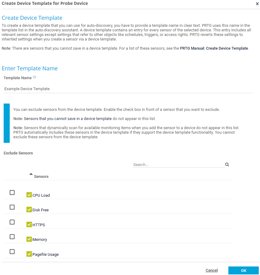 i_round_blueSensors that dynamically scan for available monitoring items when you add the sensor to a device do not appear in this list. PRTG automatically includes these sensors in the device template if they support the device template functionality. You cannot exclude these sensors from the device template.