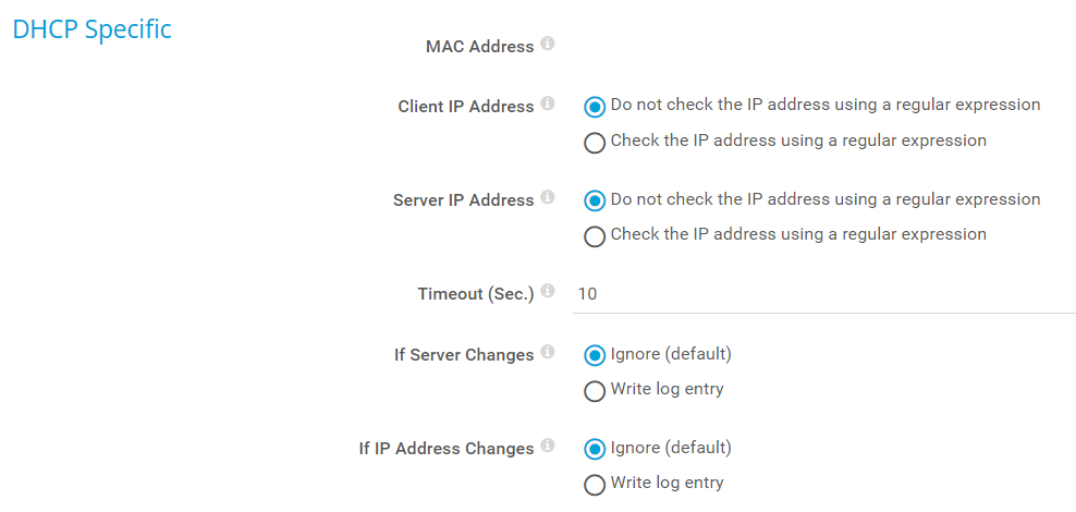 For example, enter 10\.0\.5\..* to make sure that any answering DHCP server returns any client IP address starting with 10.0.5.. If it does not, the sensor shows the Down status. Leave this field empty if you do not want to use it.