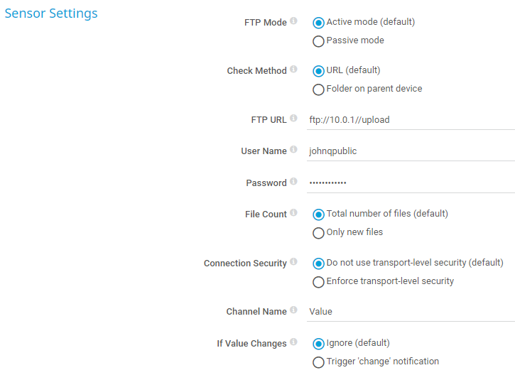 The FTP Server File Count sensor logs in to a File Transfer Protocol (FTP) server and can monitor changes to files.