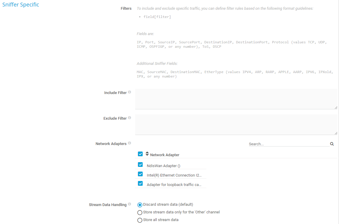 The Packet Sniffer sensor monitors the headers of data packets that pass a local network adapter using a built-in packet sniffer. You can choose from predefined channels.