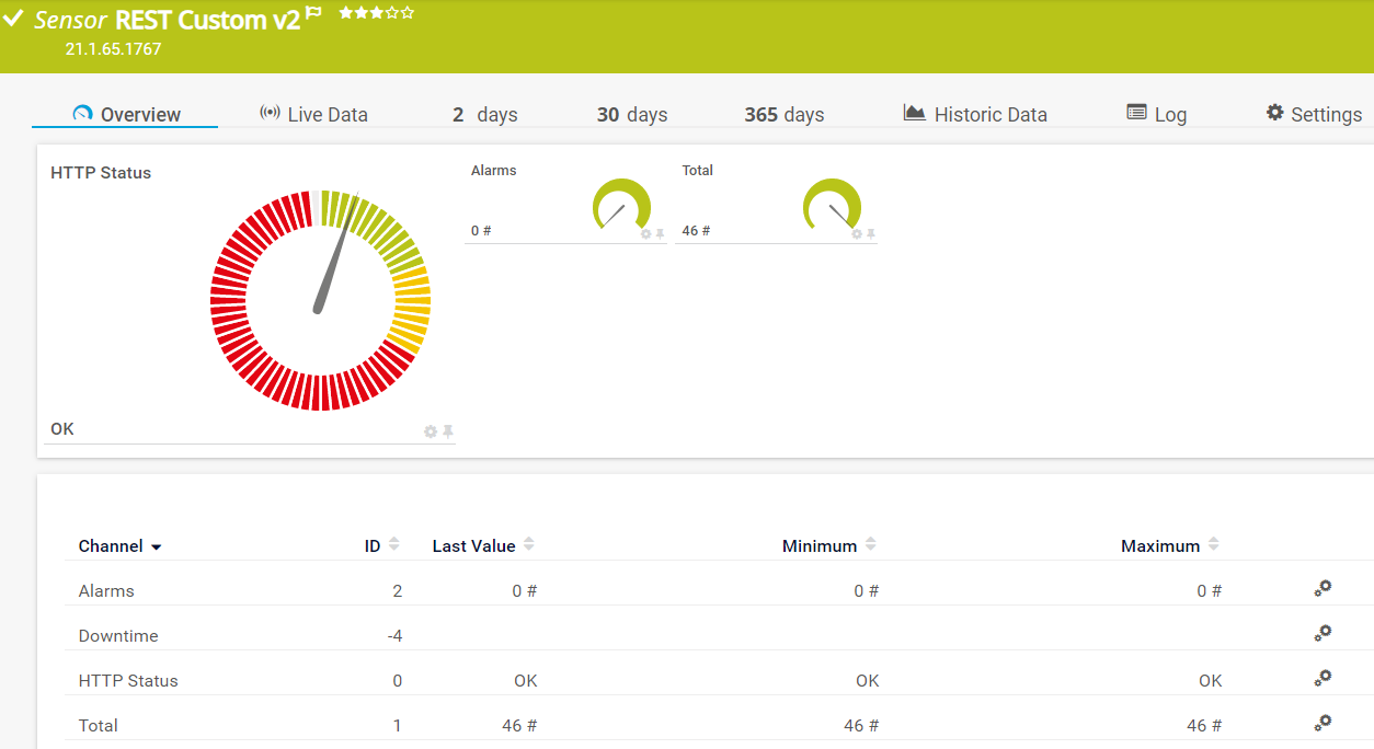 The REST Custom v2 sensor queries a JavaScript Object Notation (JSON) or Extensible Markup Language (XML) Representational State Transfer (REST) application programming interface (API) endpoint and maps the JSON or XML result to sensor values.