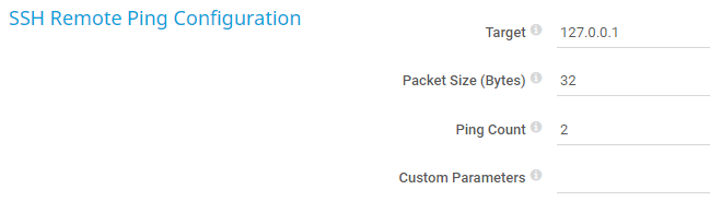 Enter the Domain Name System (DNS) name or IP address of the target device the ping is sent to. The sensor remotely connects to the parent device it is created on via SSH, then performs a ping request from this remote device to the target device or server. Enter a string.