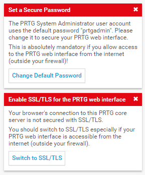 • If you still use the default password of the PRTG System Administrator user (prtgadmin) for PRTG Network Monitor, PRTG asks you to set a secure password if your PRTG web interface is publicly available. Click Change Default Password to define a new password. See also section User Accounts. Click b_close_info_box to remove this note.
