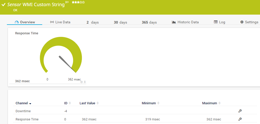 In the channel table on the Overview tab, this channel never shows any values. PRTG uses this channel in graphs and reports to show the amount of time in which the sensor was in the Down status.